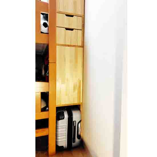 ということで、安売りしていたパイン材を駆使して2段ベッドの奥に棚を作って設置しました。下の二人は受験生なので教材がどんどん増えていくので書棚の増設が必須です。来年は衣類も、また増えそうですね。朝也の“部屋”に向いた側面は文庫本が入る奥行き55センチの引出しと旅行カバン用のスペースにしました。だいぶ片付いたと思います。