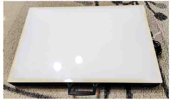トレース台といってイラスト等の下書きと本紙を重ねて下から照らして下書きがよく見えるための道具です。今どきのはLEDライトでペタンコで軽量ですが、この超古いタイプは蛍光灯です。知らない人は何の道具か悩むタイプのゴミですよね。